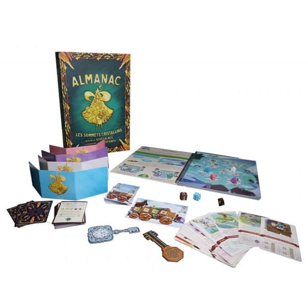 Almanac : Les Sommets Cristallins est le deuxième opus de la série Almanac du célèbre concepteur Scott Almes. Almanach : Les Sommets Cristallins est un jeu de commerce, de voyage et d’aventure dans un royaume fantaisiste ! Les joueurs visiteront des lieux étranges, achèteront et vendront des marchandises, et feront face à un ensemble de rencontres imprévisibles alors qu’ils voyageront du village des marchands à High Frost, le siège du pouvoir dans la région, ou à Two Twins City, le centre du commerce ! Dans Almanach : Les Sommets Cristallins, l’aventure et la richesse ne sont qu’à un tour de page !
